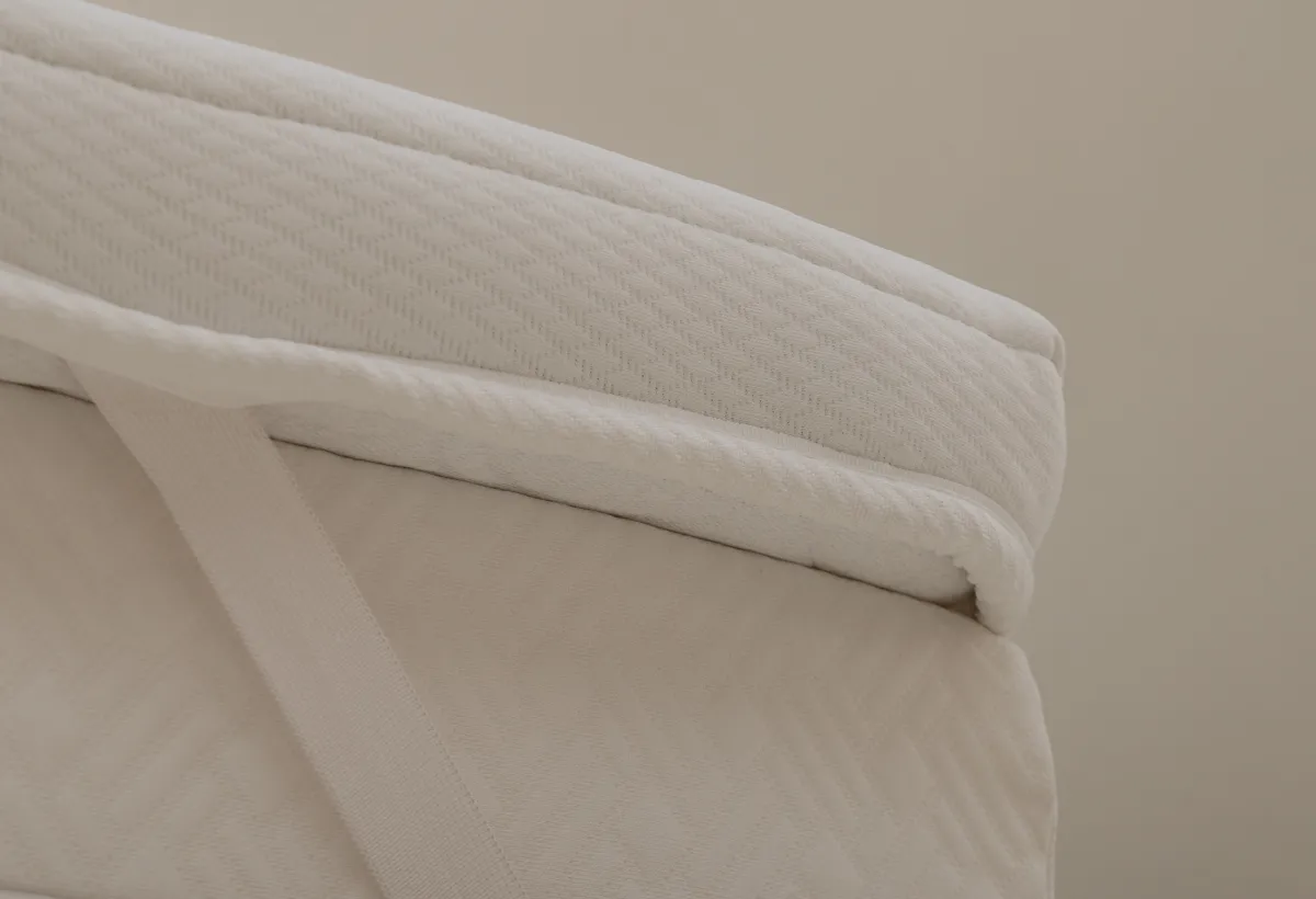 Топпер «Мелисса»: упругость и релаксЭтот топпер создан, чтобы помочь вам по-настоящему расслабиться. Он не жёсткий, а упругий и отзывчивый — тело на нём не проваливается, а мягко поддерживается. Всё дело в двух слоях пены. Нижний, 2 см, — это плотная основа для поддержки. Верхний, 3 см, — пена с рельефной поверхностью. Она создаёт лёгкий массажный эффект, который помогает снять напряжение после долгого дня. Это не интенсивный массаж, а скорее приятное покалывание для расслабления. Вместе они создают комфортную среднюю жёсткость. А стёганый чехол сверху делает поверхность приятной на ощупь.